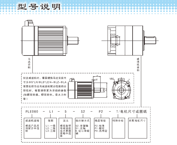 PLE060-L1-5-S-2-P2-T。就這個型號來說的話PLE是表示這個減速機的款式,060是為型號,L1為一級,5為減速機的速比,S2為輸出軸方式(S2:單鍵軸 S1:光軸,K空心單鍵軸),P2表示這款精密行星減速機的精度等級(P2:標準, P1:精度 P0:高精密),T的話表示特殊非標,T表示特殊的非標。當然這款減速機都是需要配套相應(yīng)的伺服電機,在生產(chǎn)的時候就需要配套相應(yīng)的伺服電機圖紙。