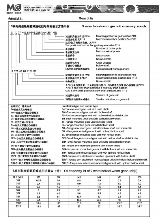S斜齒輪蝸輪減速機(jī)又稱“S斜齒輪硬齒面減速電機(jī)”,功率范圍為:0.1KW~160KW,扭矩范圍為:110~10200N,m,速比范圍為23.8~389,由上圖型號所示,S斜齒輪蝸輪減速機(jī)可由任意功率,速比等組成,在選型的時候首先要確認(rèn)自己所需要哪款,然后結(jié)合選型手冊來填寫正確的型號。