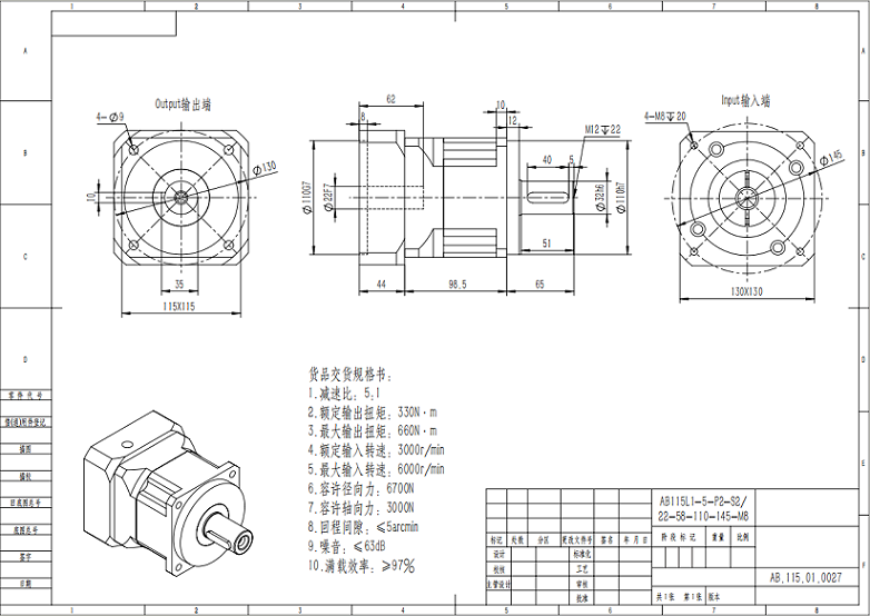 邁傳行星減速機(jī)AB115L1-5-P2-S2-22-58-110-145-M8安裝尺寸圖如下: